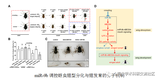 翅型分化是蚜虫对不良栖息环境的适应,蚜虫通过提高飞行能力使其逃离不良环境并找到新的栖息地,多种蚜虫在种群密度过大时存在跨代翅型分化现象。miRNA作为重要的后转录调控因子,能否介导高种群密度诱导产生的蚜虫翅型分化及其调控网络尚不清楚。项目组以褐色桔蚜(Aphis citricidus)和豌豆蚜(Acyrthosiphon pisum)为研究对象,探讨miRNA在蚜虫翅型分化和翅发育过程中的重要作用。研究鉴定到在翅型分化和翅发育过程中唯一下调的miRNA(miR-9b),其靶向调控ABC(ATP-binding cassette)转运蛋白(ABCG4);低种群密度下,抑制miR-9b的表达显著增加后代有翅率;而在高种群密度下,过表达miR-9b则会降低后代有翅率。此外,在翅发育过程中过表达miR-9b则会导致翅发育畸形;最后,研究发现miR-9b通过调节胰岛素信号通路活性进而影响蚜虫的翅型分化。研究结果拓展了miRNA作为环境因子的信号“传递介质”调控昆虫表型可塑性的分子机理。