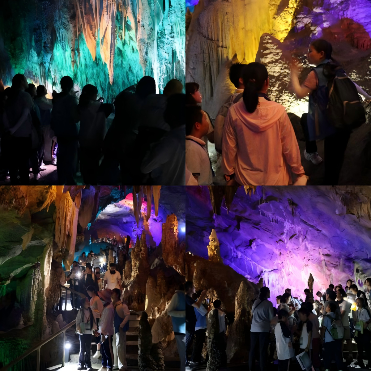 在“世界三大洞穴之一”的芙蓉洞,识别石钟乳、石笋、石柱等典型喀斯特地貌,了解其成因机制,并围绕“溶洞开发与保护”开展科学讨论,理解科学保护的重要性。同时讲述了袁道先院士2004年陪同世界自然保护联盟喀斯特与洞穴保护管理组主席史密斯教授考察武隆喀斯特的故事。