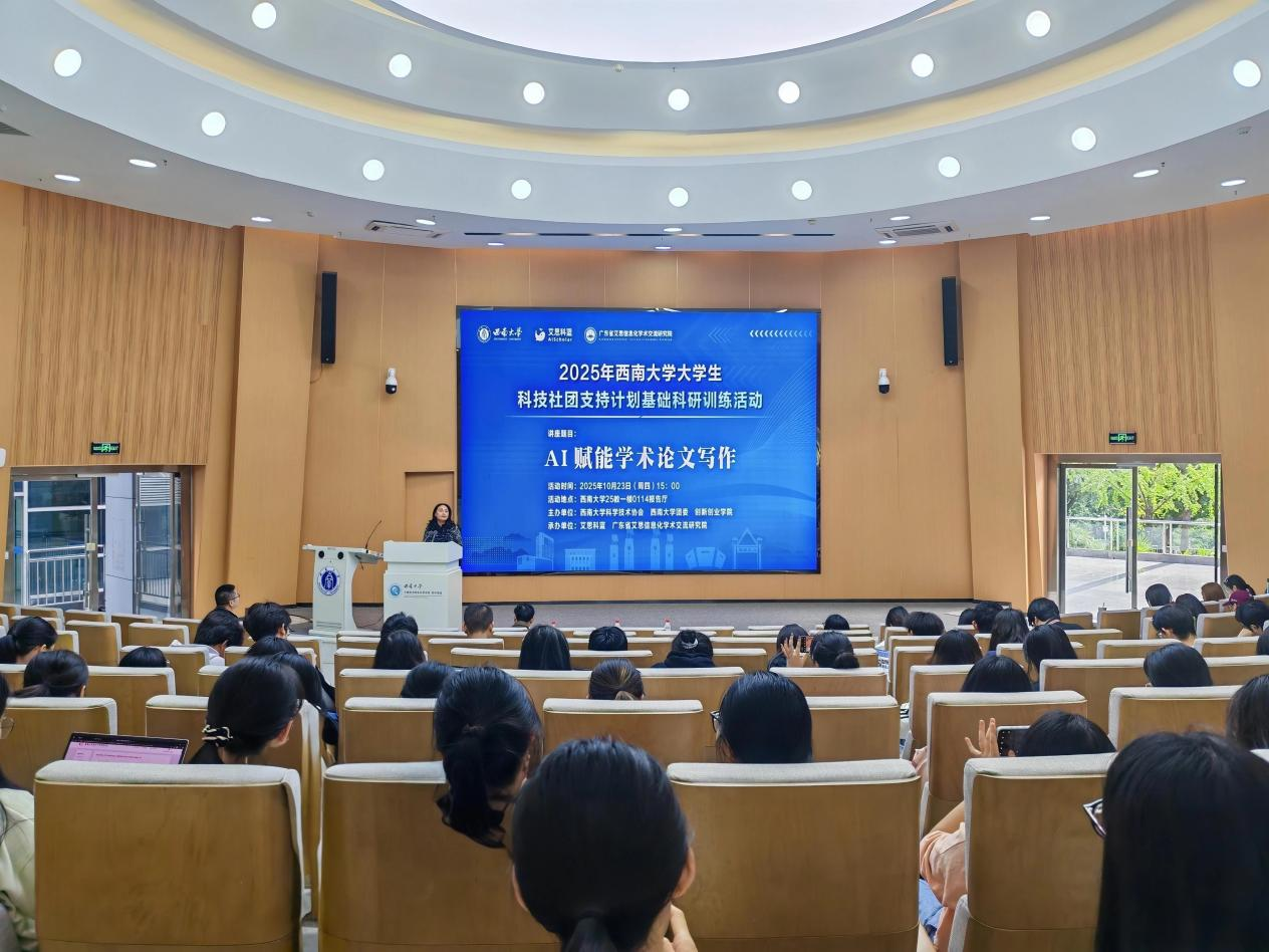 10月23日,由西南大学科学技术协会、校团委与创新创业学院联合举办的大学生科技社团支持计划基础科研训练活动在西南大学25教一楼0114报告厅顺利举行。本次讲座主题为“AI赋能学术论文写作”,特邀重庆大学电气工程学院博士生导师、电子技术基础教学实验中心副主任、空间技术研究所副所长仲元昌教授作专题讲座。学校各科技社团成员200余人参加活动。